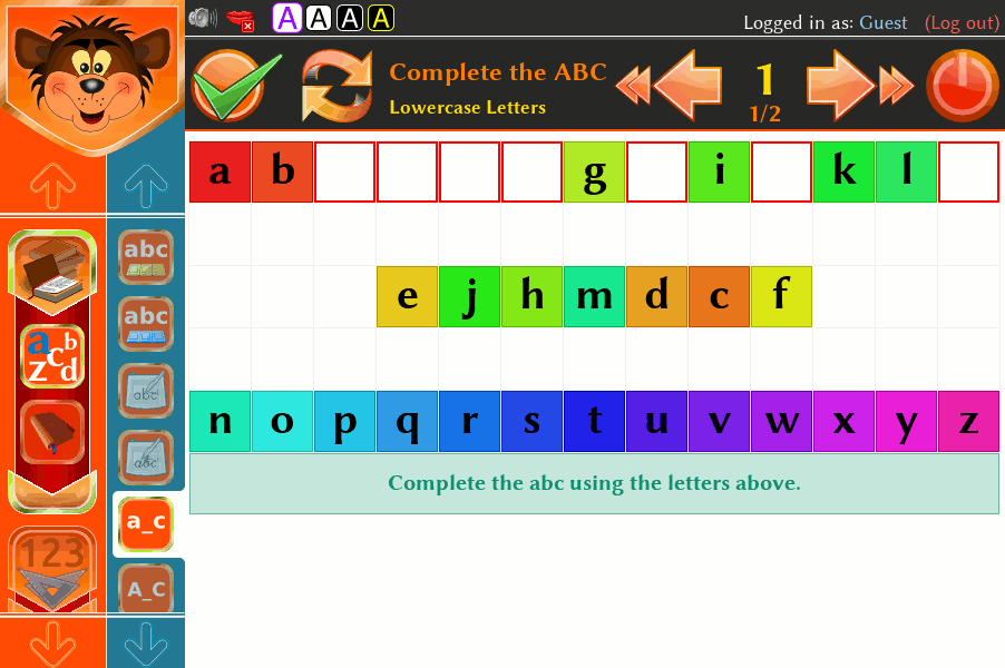 - Displays the level you are on within the selected activity. In some cases this number is not really indicating the level but only shows what part of the activity you are playing at certain time (i.e. which image you have selected to put together - the complexity of the task is the same only the image is different).